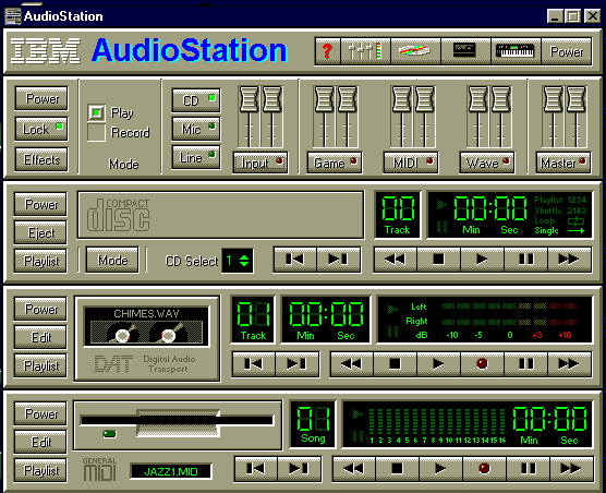 If any modules are missing, single left-click to open the missing module from the PowerBar. Starting from the IBM Trademark on the PowerBar and moving right across the PowerBar, the icons are for the Audiostation help, the Mixer Module, the CD Player Module, the Wave Module, and the MIDI Module. Left single-click on the appropriate icon to open the module. If an error occurs, you will have to reload the Audiostation Application.