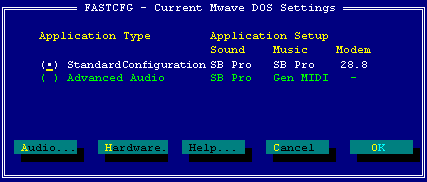 11. At this point, the Mwave is now setup to be used as a modem and soundcard in the telegaming software. If this setting is correct and it is not working, test the Mwave by standard testing procedures . If the Mwave passes, review the game setup to verify that you have chosen the SoundBlaster sound card and Hayes compatible 28.8 kbps modem. If the game still fails, please contact the manufacturer of the game.
