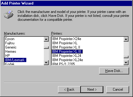 7. This window displays the manufacturer and the type of printers that Windows 95 or 98 knows about. Select the manufacturer by sliding down the scroll bar on the right of the manufacturer box until it is displayed. Click on the manufacturer. In this case, the selected manufacturer is IBM/Lexmark.