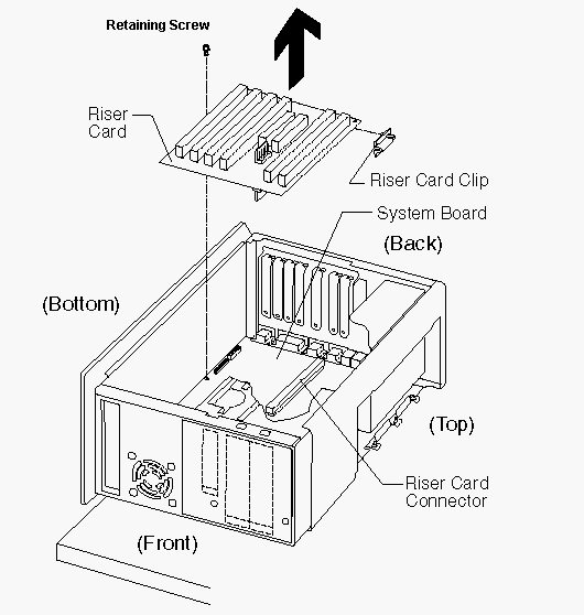 6. You should now have clear access to the riser card. Remove the riser card retaining screw (located at the bottom of the card), and the riser card clip (depending on the release date of your system this clip may or may not be present. There is a tab on the clip that must be pinched when removing or replacing the clip.), and then pull the riser straight back out of its slot (see Figure 2).