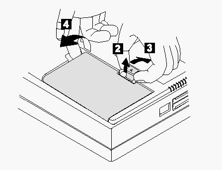 Pull up the battery pack latch 2, push it back 3, and then pull the battery pack 4.