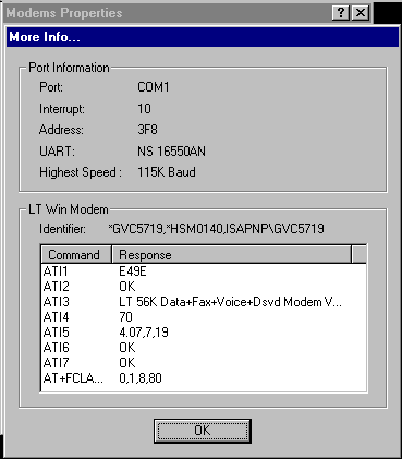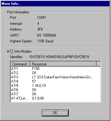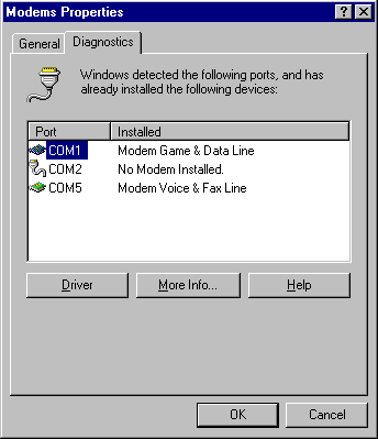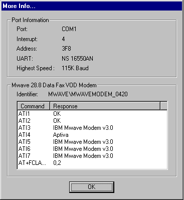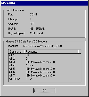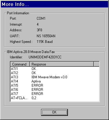 2. Click on the "Diagnostics" tab at the top of the screen. Make sure "COM1" is highlighted, then on the "More Info" button. The following are the screens that should be seen with the respective models.