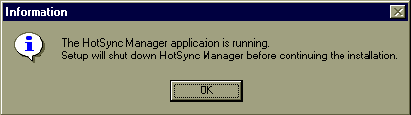 16. If you receive the following notice, select OK, and it will shutdown HotSync Manager to continue.  Select OK.