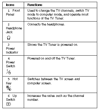 The following table shows how to operate all functions of the TV Tuner with the controls on the front panel.