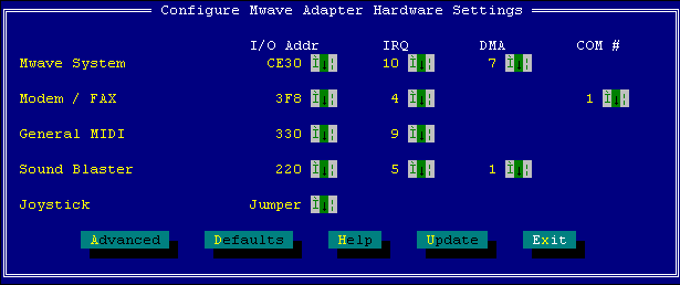5. The file HWCONFIG is useful to see the Mwave adapter's settings and to reset them to factory defaults. Type in HWCONFIG at the DOS prompt and press the "Enter" key on the keyboard. The screen shot below is from HWCONFIG and shows the default settings on a Mwave card. You should get the screen similar to below but it may be different depending upon the Mwave card in the machine. Press "D" on the keyboard and it will reset the Mwave to the default settings. Press "X" on the keyboard to exit the program. The machine should return to the "C:\MWW\UTILS" DOS prompt.