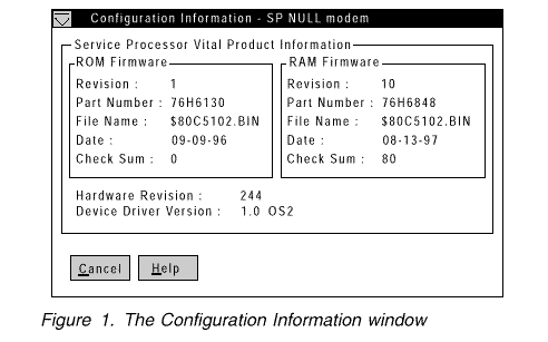 Configuration Information: The Configuration Information window (shown in Figure 1) contains detailed information about the system management subsystem, including RAM microcode, ROM microcode, and device-driver information.