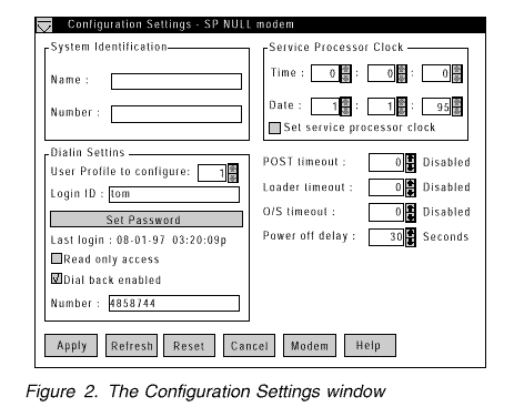 Configuration Settings: Use the selections available in the Configuration Settings window (see Figure 2 on page 50) to configure many features of the system management subsystem. These features include system identification data, dial-in security settings, the time and date reported by the system management subsystem clock, timeout and delay values, and advanced modem settings.