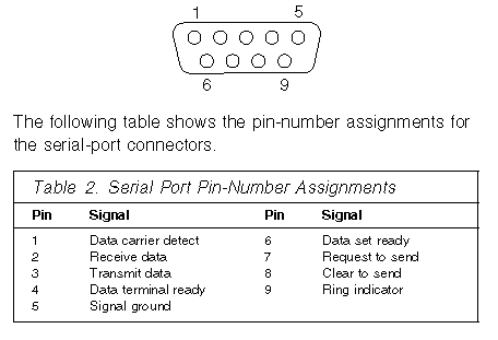 Each serial port has a 9-pin, male D-shell connector on the back of the server. The pin-number assignments of this