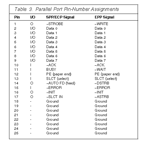 The following table shows the pin-number assignments for the parallel-port connector.