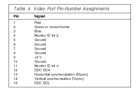 The following table shows the pin-number assignments for the video connector.