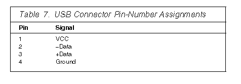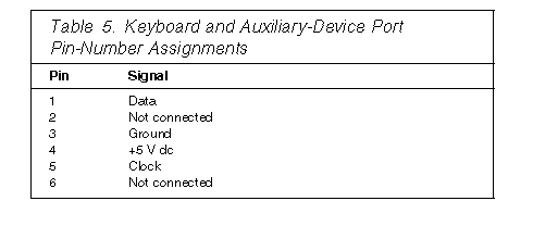 The following table shows the pin-number assignments for the connectors used by the keyboard and auxiliary-device