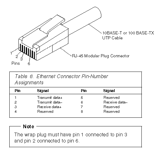 Table 6 shows the pin-number assignments for the RJ-45 connector. These assignments apply to both 10BASE-T and 100BASE-TX devices.