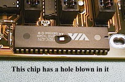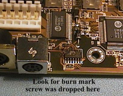 The following two images explain another hazard. A technician had just finished assembling a new Pentium 150 Computer and found he had left a screw out of one of the back plane covers. Without switching the computer off, he attempted to screw the missing screw into the back plane but dropped it onto the system board. These images tell the rest of the story. The System Board, the Sound Card and the Video Interface card were destroyed in this incident.