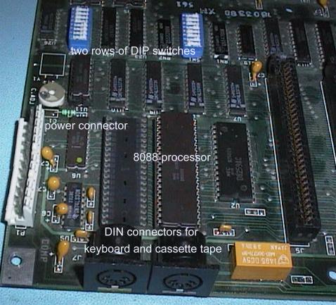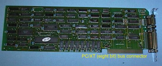 The first hardware we will look at is the system board out of an original IBM PC. The PC and PC/XT computers used the 8088 processor chip with its 16 bit internal data bus, eight bit external data bus, and 20 bit address bus. The bus connectors are called the PC/XT bus or eight bit bus.