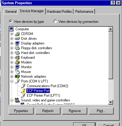 4. Once in Device Manager, you should locate the item that has the conflict. A conflict is indicated by an exclamation mark. Highlight the device by clicking on it once with the left mouse button then click on the button marked Properties.