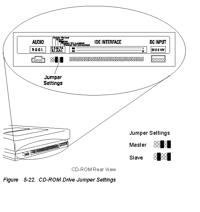 The CD-ROM drive is connected to the system board secondary drive connector at the factory. CD-ROM drive jumpers are set as the master drive. If an additional hard disk drive is connected to the secondary connector, it must be set as the master drive and the CD-ROM drive jumpers reset as the slave drive as shown .