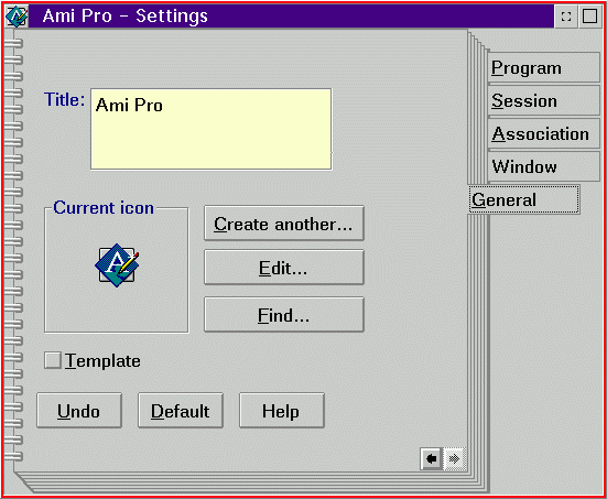 The Settings notebook for the new program icon will be displayed as above. Fill in the path to the program (or click the Find button to have OS/2 find programs for you); click the General tab and fill in the program name in the Title section.