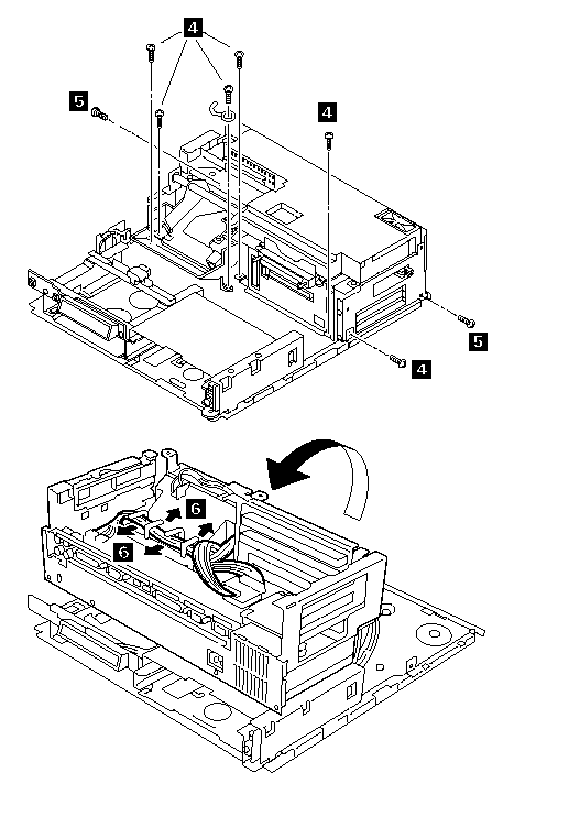 Lift up and turn over the power supply assembly then release the cables on the rear of the rack 6. Remove all remaining cables from the connectors on the main card. Turn the power supply assembly to the upright position.