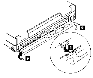 Remove the center latch (1) ; then remove the rear connector door by flexing it (2).