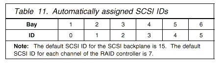 The SCSI backplane in the server supports up to six hot-swap bays. Table 11 shows the default SCSI IDs that the backplane assigns for hot-swap hard disk drives.