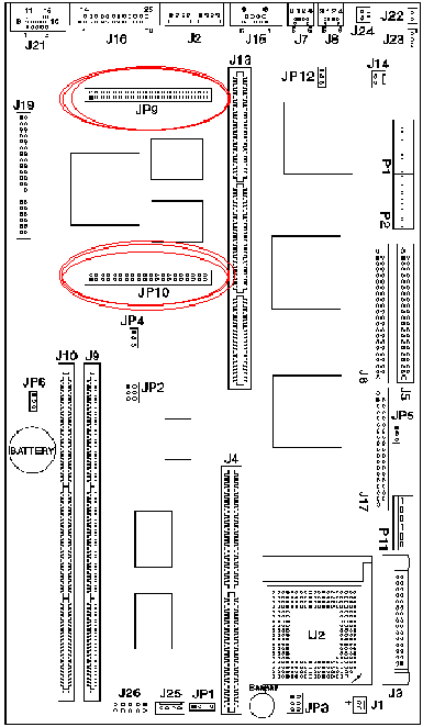 The video memory for these systems is available from ATI Technologies. The memory connects to locations JP9 and JP10 on the system board as shown highlighted below.
