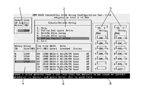 When you configure the disk array, or even just view its configuration, you will be using the IBM RAID configuration program on the IBM SCSI-2 Fast/Wide Streaming-RAID Adapter/A Option Diskette (also called the IBM RAID controller diskette). The following figure is a compilation of many of the IBM RAID Controller Disk Array Configuration (also called the IBM RAID configuration program) screens. The list below the figure gives explanations of the numbered areas of the figure.