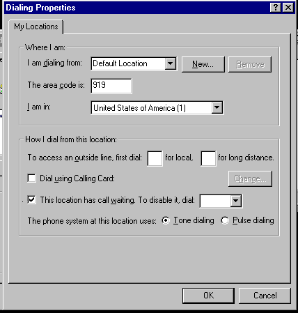 7) Click 'OK' twice to get back to the 'Modem' screen, then click on the 'Dialing Options' button and verify that it is setup as shown in Figure #6. Insert your correct area code in the 'Area code' box and '1' in the 'For long distance' box. There also is an option to disable call-waiting. This restricts an incoming call from disrupting a FAX or a file download. The code for this is available from your local telephone company. It is usually something like '*70'.