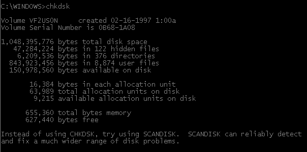 - Click on "Start", "Programs", MS-DOS Prompt. Type "chkdsk" and press "Enter" key, or: