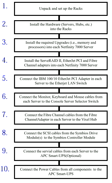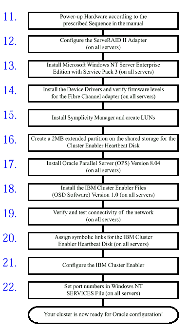 These steps outline the procedures necessary to successfully set up an IBM Netfinity cluster for Oracle Parallel Server. The attached diagram shows the wiring of a two-node cluster, but the same principles apply to four- and six-node clusters. You should plan plenty of time to set up the entire cluster (at least 16 hours).
