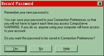 Please verify that you have written down your password correctly. If you do not wish to have to reenter your password every time you connect, click Yes. For more information, click Help.