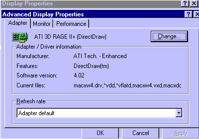 8. On the right side, click on the appropriate chips set. The figure 2 shows the manufacturer ATI Technologies - Enhanced and the chipset is ATI 3D Rage II+ (Direct Draw). Then click the OK button.