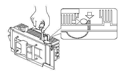 The Pentium II processor module with holes on one side to hold the clips of the heat sink and fan. The upper set of holes (near the latches) on the processor are wider and should match the wider ends of the clips on the heat sink. The lower set of holes are smaller and should match the narrow ends of the heat sink clips.