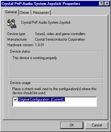 Figure 1: Joystick Properties screen from a system using a Crystal Audio sound card.