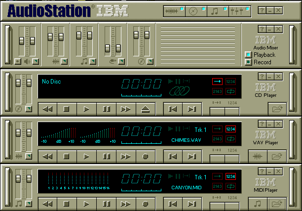 Figure 1. shows: from the top to the bottom, the PowerBar, the Audio Mixer, the CD Player, The Wave Player and the MIDI Player modules. The PowerBar will always be at the top but the other modules may be in different orders or not present at all. If not all modules are present, click on the appropriate icon to open the missing module from the PowerBar. Starting from the IBM Trademark on the PowerBar and moving right across the PowerBar, the icons are for the Wave Module, the CD Player Module, the MIDI Module, and the Mixer Module. If an error occurs and Audiostation fails, you will need to reload the Audiostation Application.