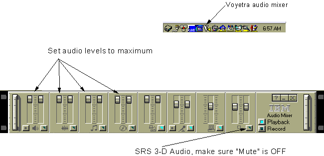 Use the Voyetra Audio Mixer (preloaded on all TP770) to set the software volume control. To open the mixer, click on the "V" icon located on the bottom right hand side of the screen (near the clock). Make sure all the audio playback levels are set to maximum (see diagram below). Some audio CDs can create distortion if the software audio levels are set to maximum ... simply lower the software CD audio level until the distortion goes away. Always test your audio level settings before a demo .... the 770 can be very loud !