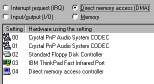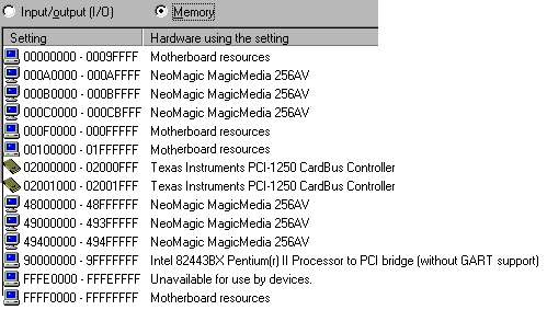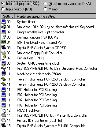 These are the default System Resources allocated by Windows 98 on ThinkPad 380Z.