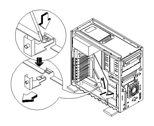 - Use a flat blade screw driver (you can use other instruments with the same features), gently push the BKT hook which stabilizes the Riser Card until it loosens as shown in the following figure.