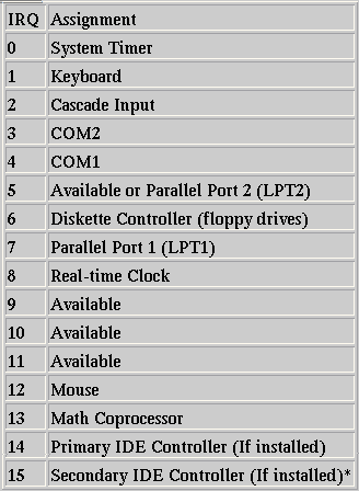The default IRQ/Assignment table below illustrates which resources may be available should you need to change