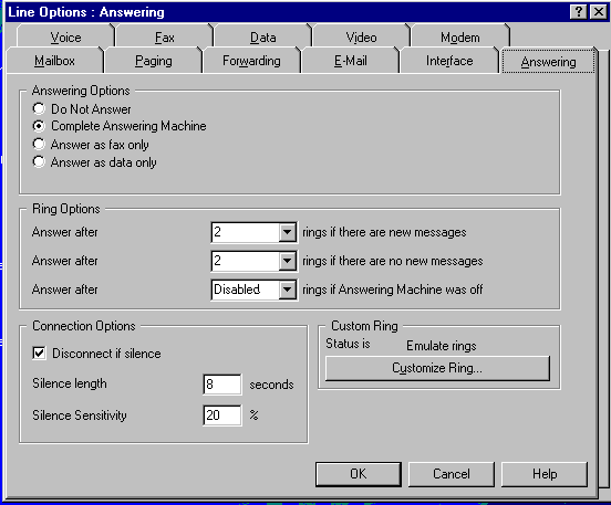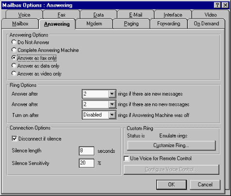 4. The 'Mailbox Options' screen will appear. Click the tab labled Answering. The 'Mailbox Options: Answering' screen will come into focus. Click the radio button labled 'Answer as Fax Only' as shown in Figure 4.