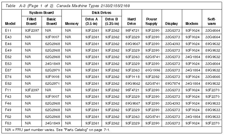 PS/1 - FRU Part Numbers for Canada M/T 2133/2155/2168