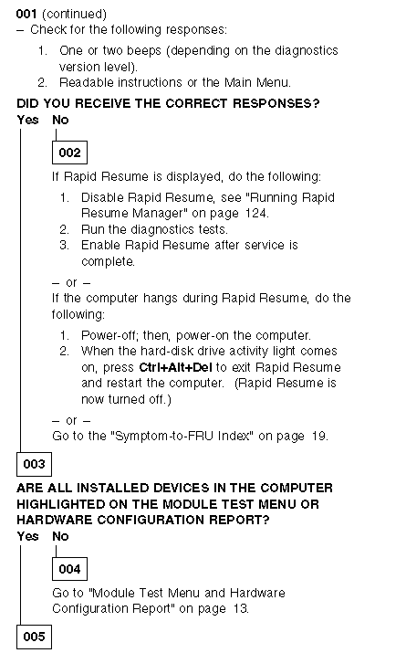 Notes: 1. Before replacing any FRUs, ensure the latest level of BIOS is installed on the system. A down-level BIOS might cause false errors and unnecessary replacement of the system board. For more information on how to determine and obtain the latest level BIOS, see BIOS Levels. 2. If multiple error codes are displayed, diagnose the first error code displayed. 3. If the computer hangs with a POST error, go to Symptom-to-FRU Index. 4. If the computer hangs and no error is displayed, go to Undetermined Problem. 5. If an installed device is not recognized by the diagnostics program, that device might be defective. |