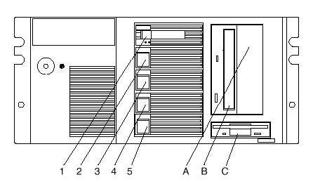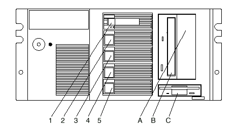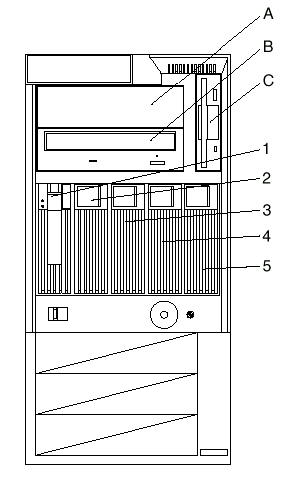 Your server comes with a CD-ROM drive installed in bay B and a diskette drive installed in bay C.