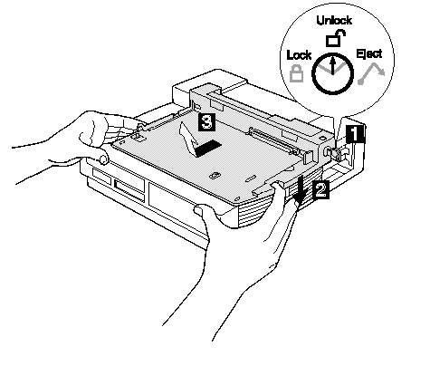 Make sure that the security key is set to the Unlock position 1 and release the latch 2 ; then undock the Base Model.