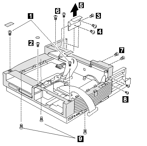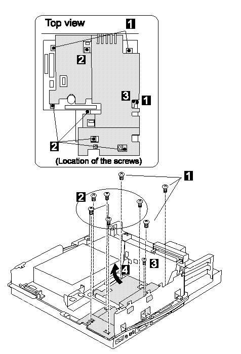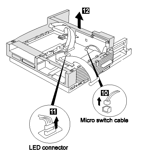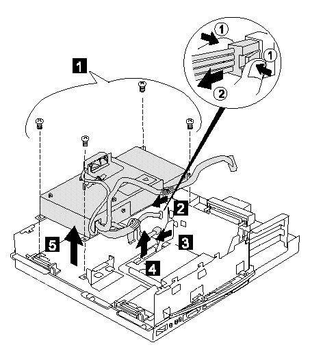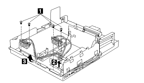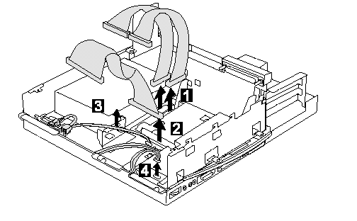 This step is a preparation for removing the main card assembly. Remove the IDE cables 1 , the SCSI cable 2 , and the audio cable 3 ; then disconnect the speaker connector 4.