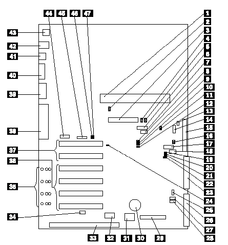 The following illustration shows a layout of the system board and identifies system board components. You might need to refer to this figure before you install hardware in the server, or when you record information in the tables in this chapter. You might also need to refer to this figure when you set configuration jumpers on the system board.
