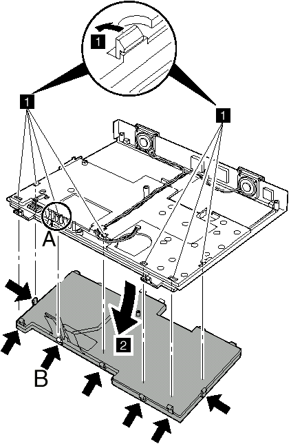 Important: When you release latch B, be careful not to apply any force to area A (lenses for status indicators).