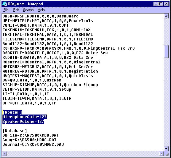 Click on Search and then Find and type in "router". Click on Find Next. Router should now be highlighted. Close the Find Next dialog box, and scroll down to view the MicrophoneGain and SpeakerVolume setting. Change the value of MicrophoneGain to 240.