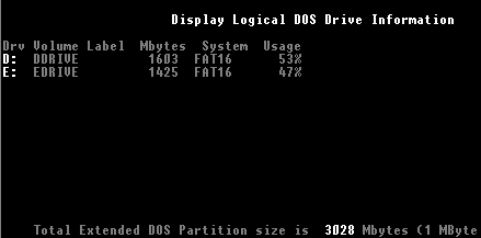 Enter choice "4" and press "Enter" key. This will bring you to the "Display Partition Information" screen similar to the one shown below. Earlier models usually only have one partition and will have no option for EXT DOS information.