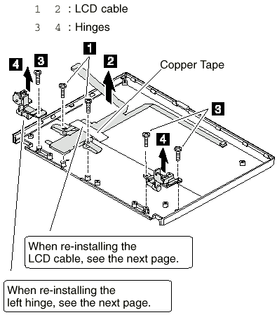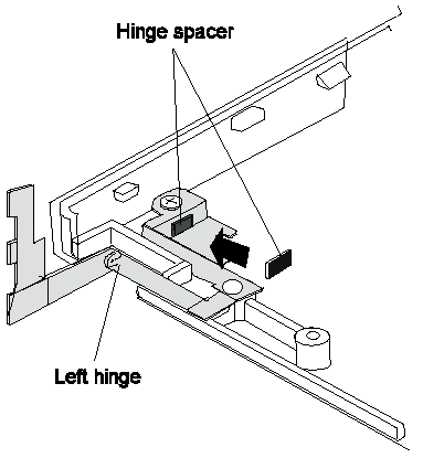 If you are replacing hinges of the TFT panel, put a spacer (P/N 05K4658) on the left hinge as shown below: