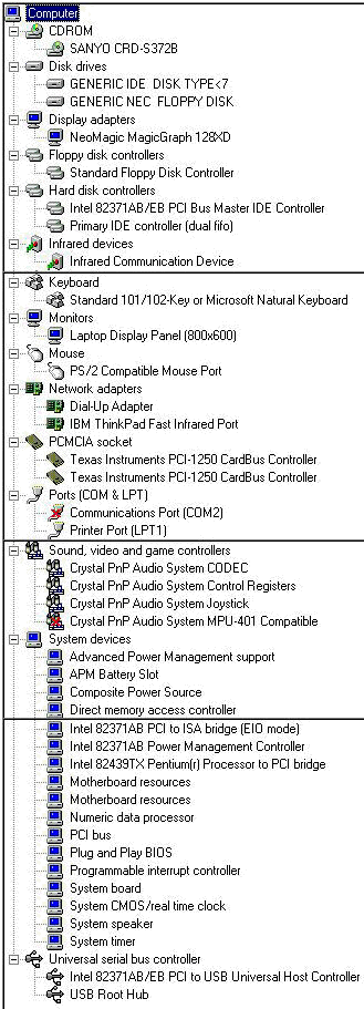 This document provides the Default Device Manager listing for the ThinkPad 385XD that came preloaded with Windows 98.